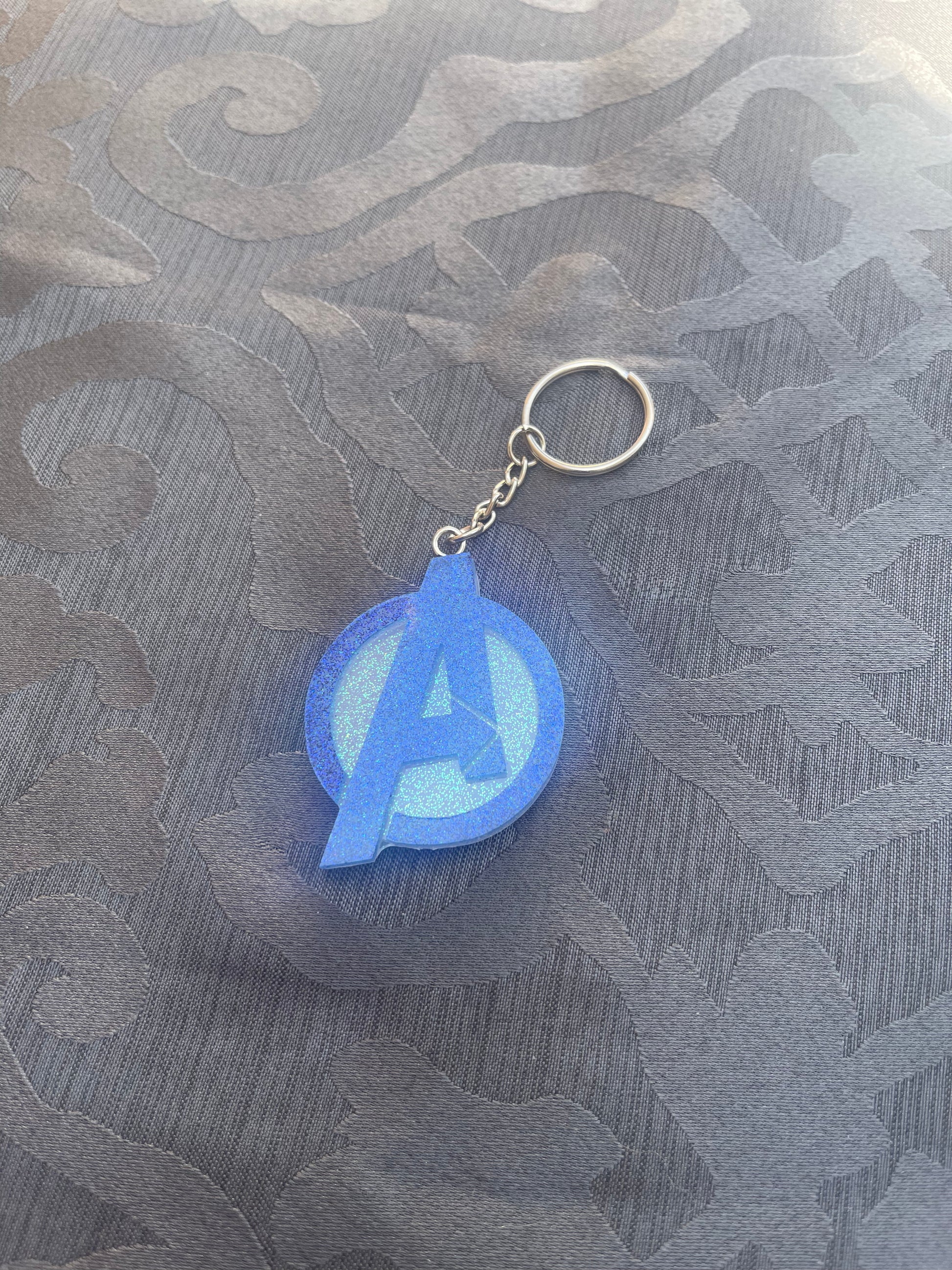 Avengers “A” keychain in blue with a white glitter background. Comes on a keychain ready to go.