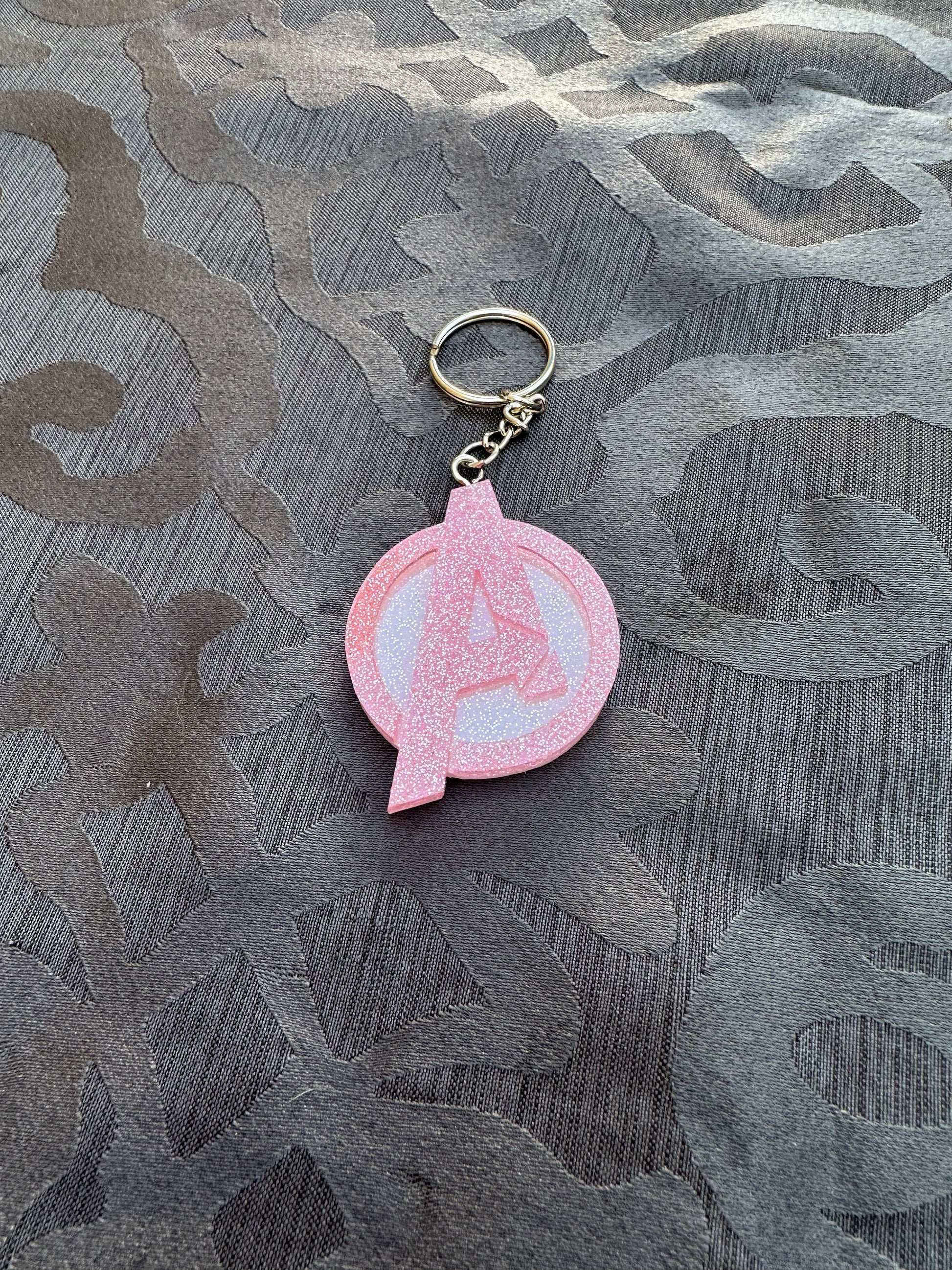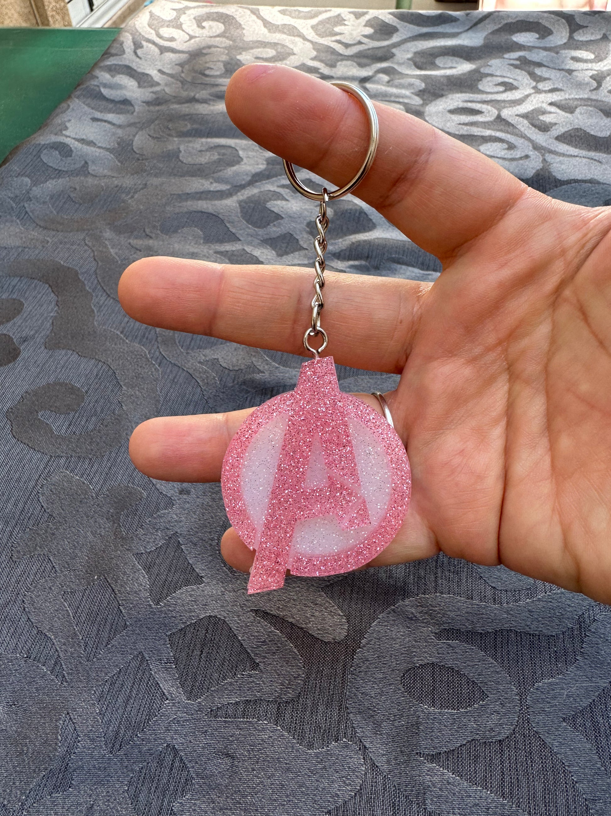 Avengers “A” keychain in Pink with a white glitter background. Comes on a keychain ready to go.