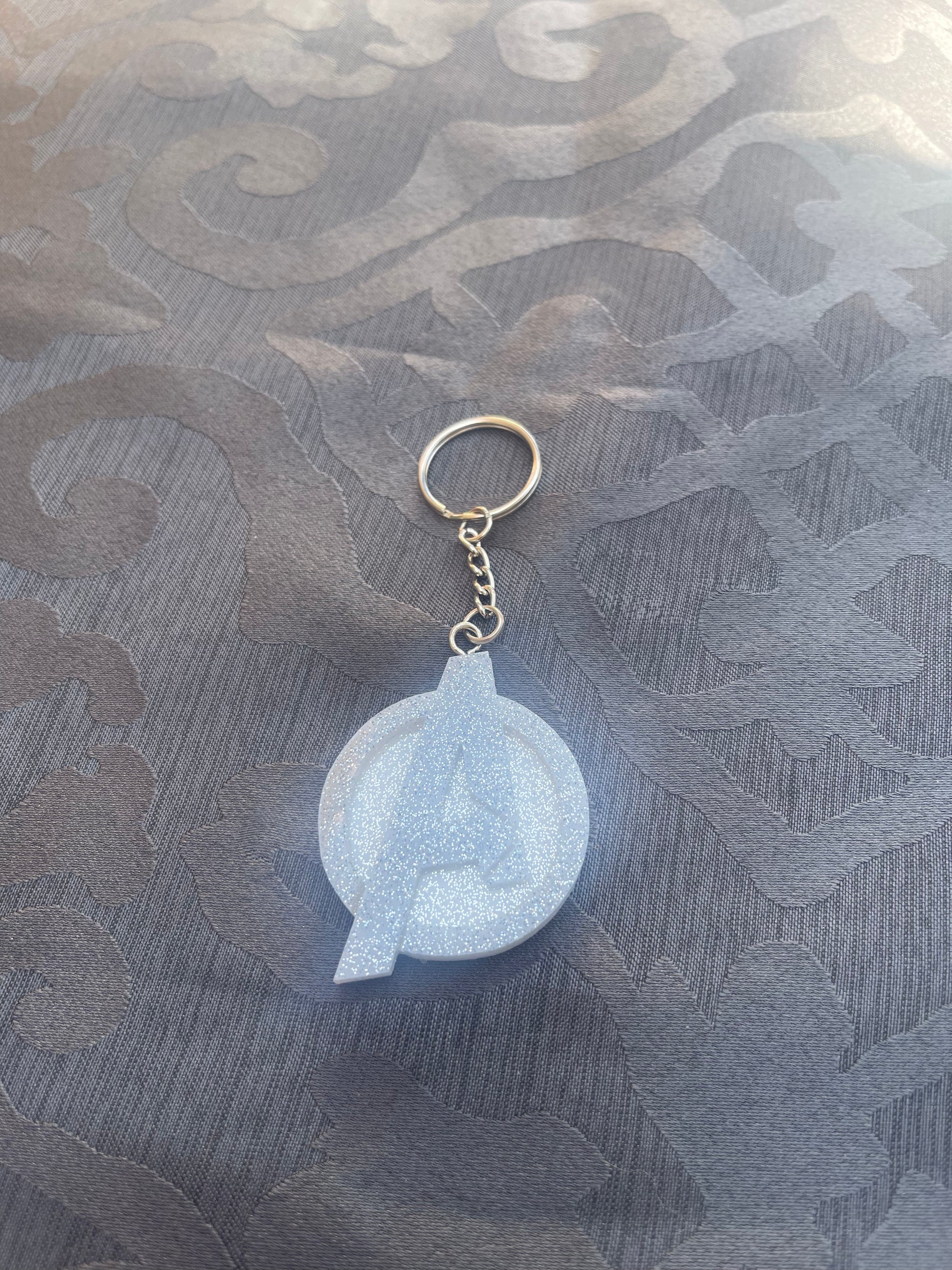 Avengers “A” keychain in silver with a white glitter background. Comes on a keychain ready to go.