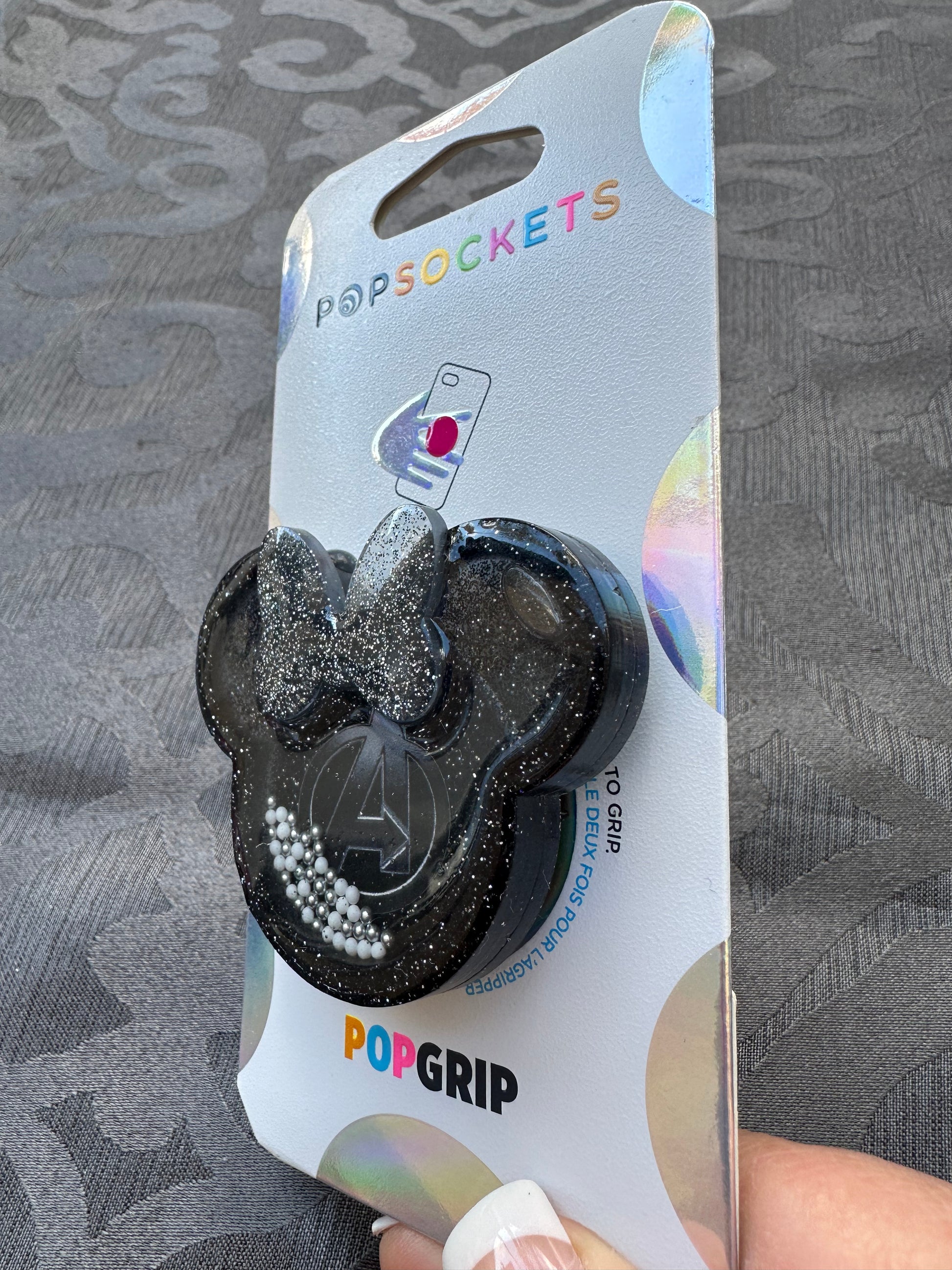 Avengers Mouse w/bow shaker phone grip in Silver with a Dark Grey bow filled with glitter and beads