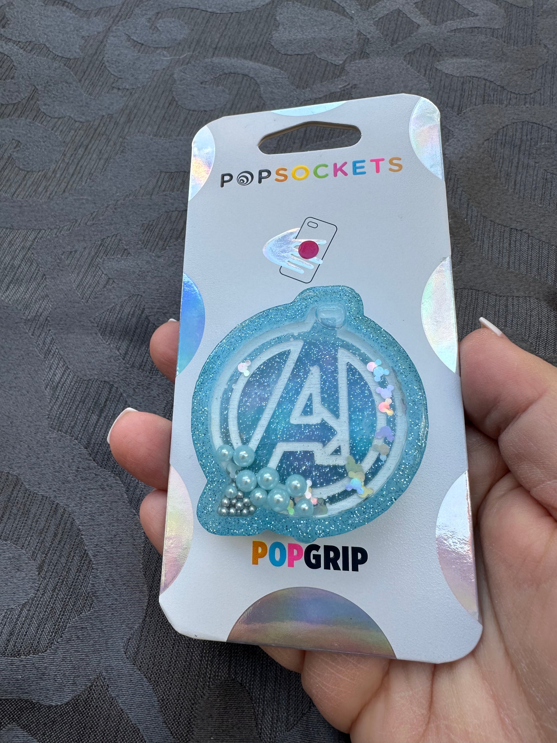 Avengers Logo shaker phone grip in Light Blue filled with beads and glitter