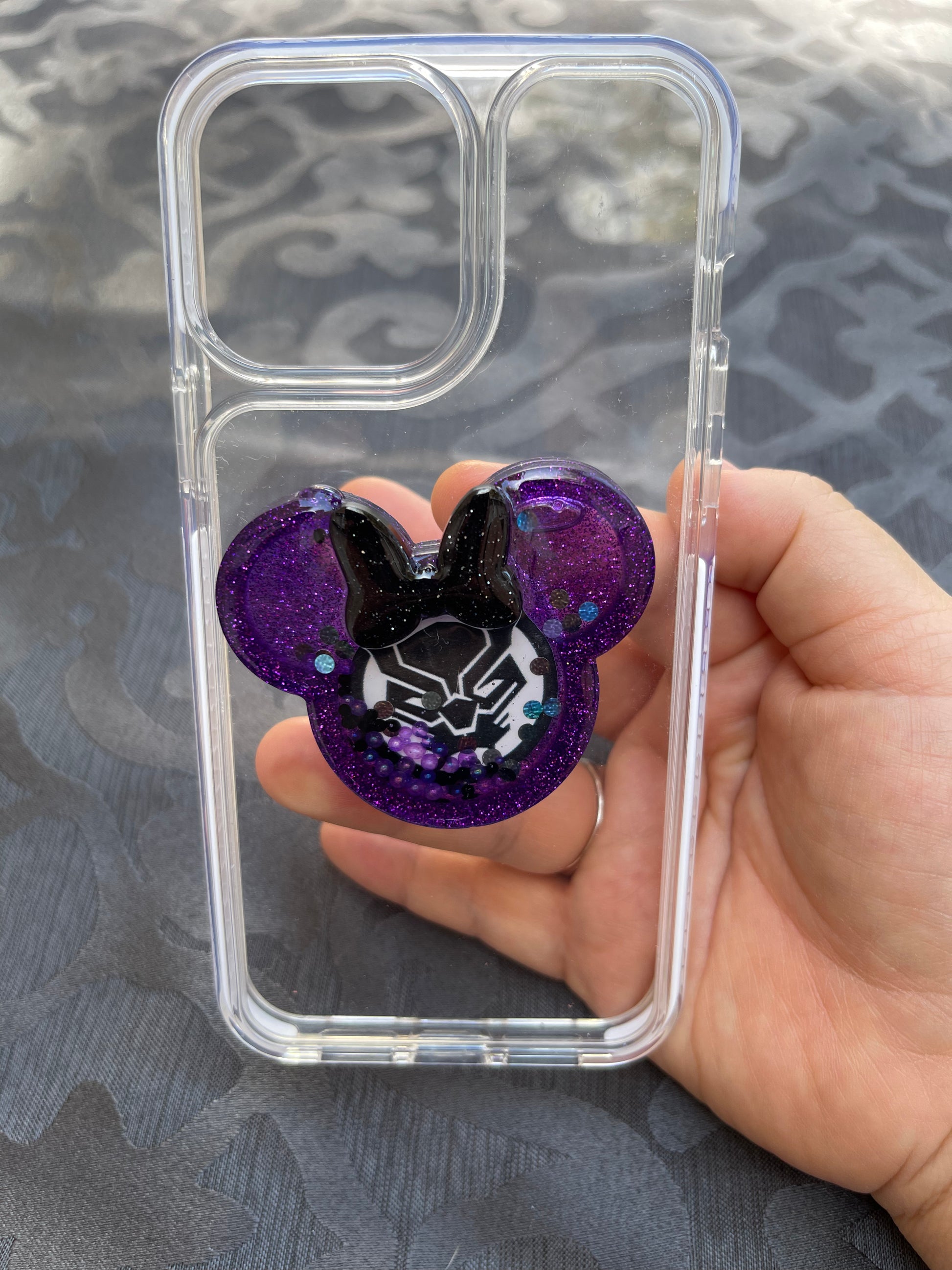 Black Panther Mouse w/bow shaker phone grip in Purple with a Black bow filled with glitter and beads