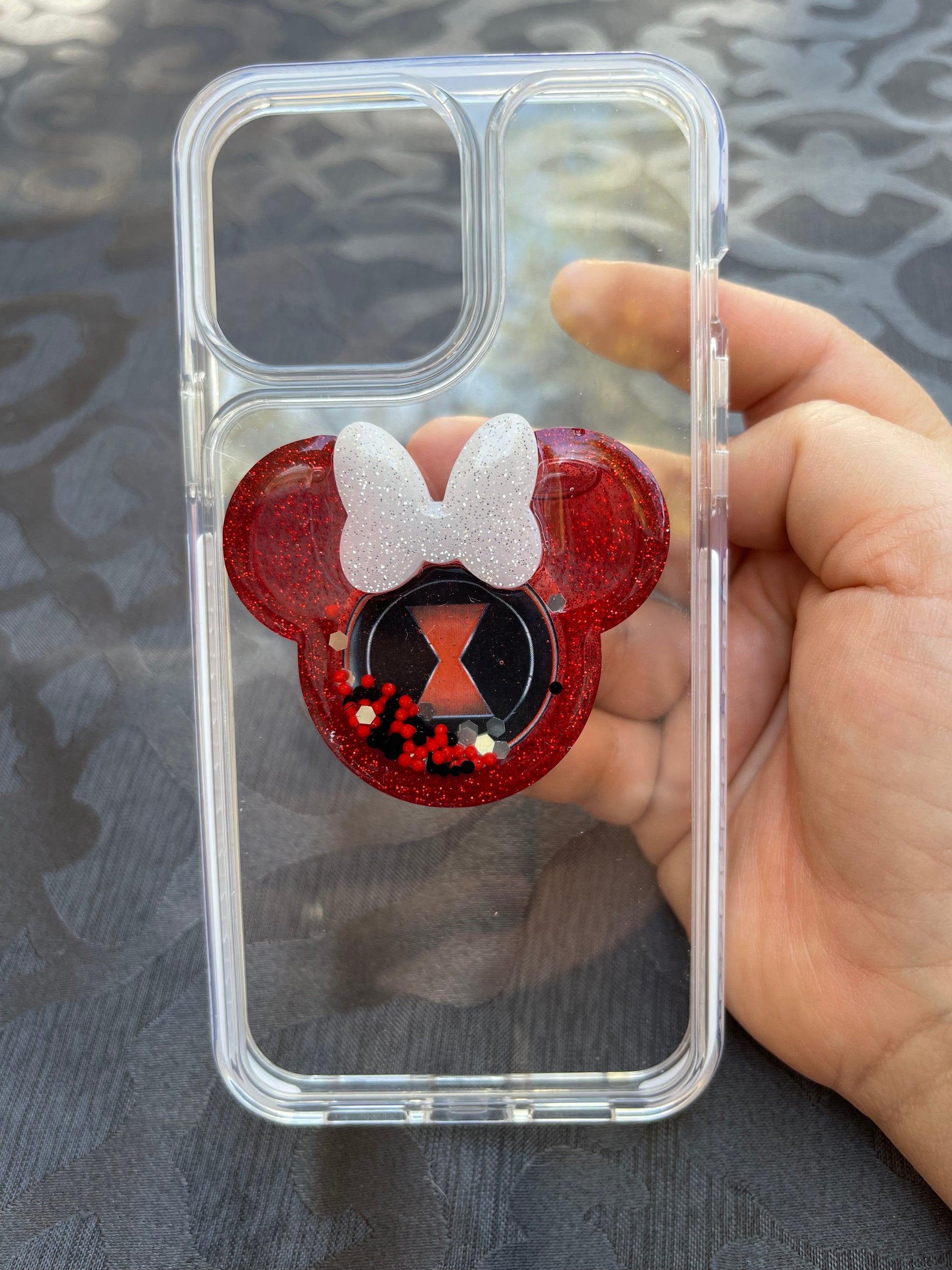 Black Widow Mouse w/bow shaker phone grip in Red with a Black bow filled with glitter and beads