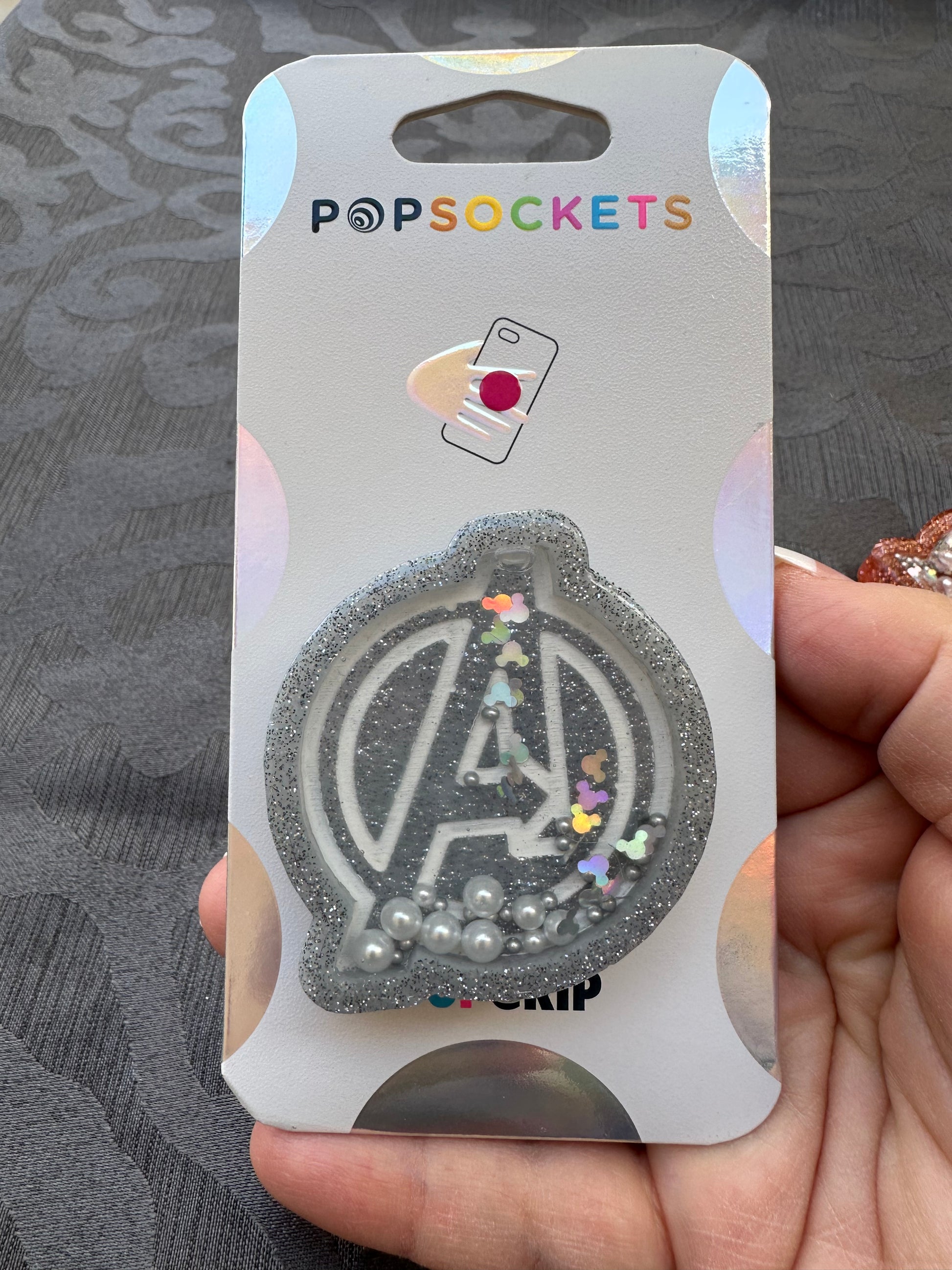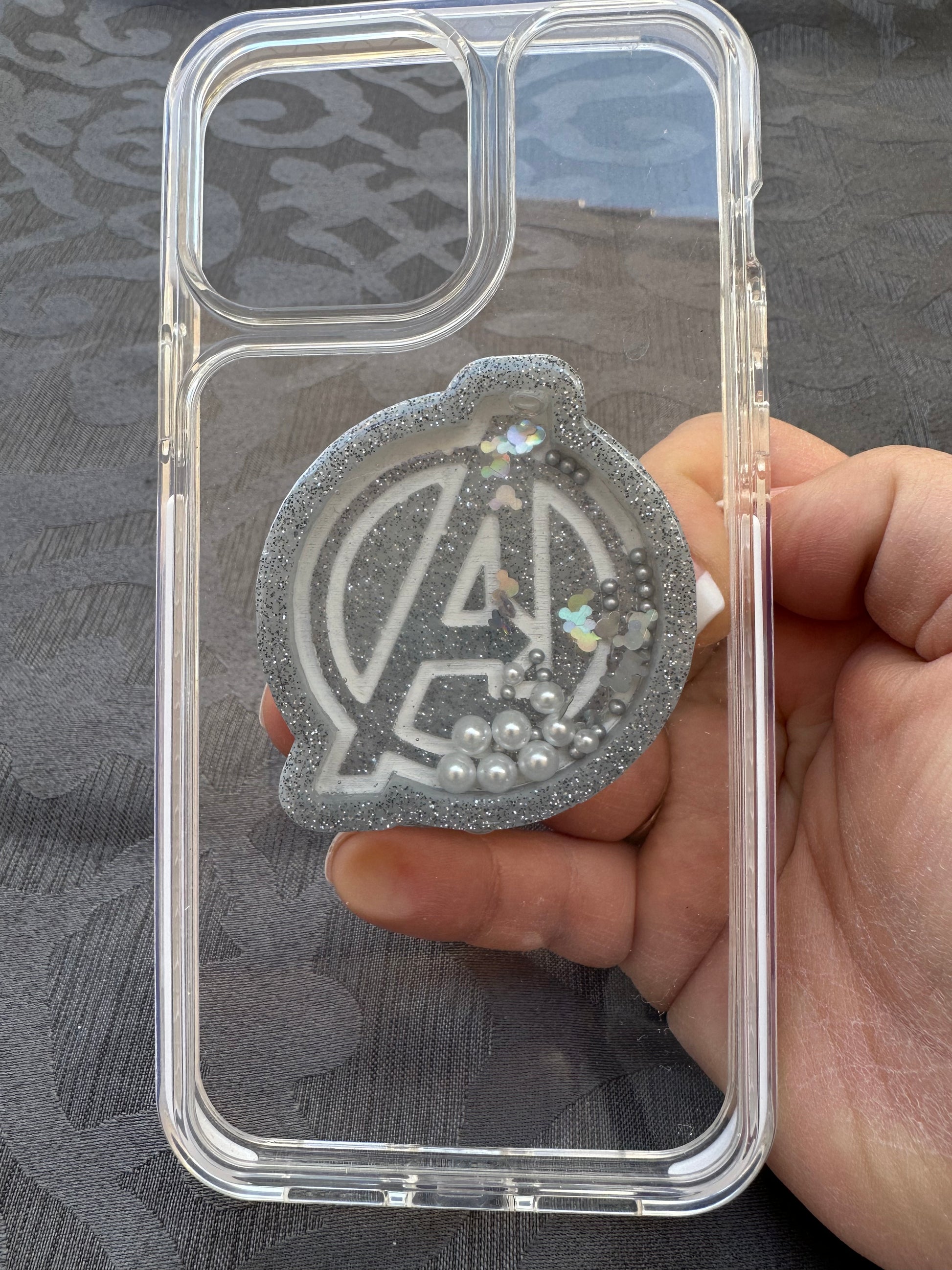 Avengers Logo shaker phone grip in Silver filled with beads and glitter