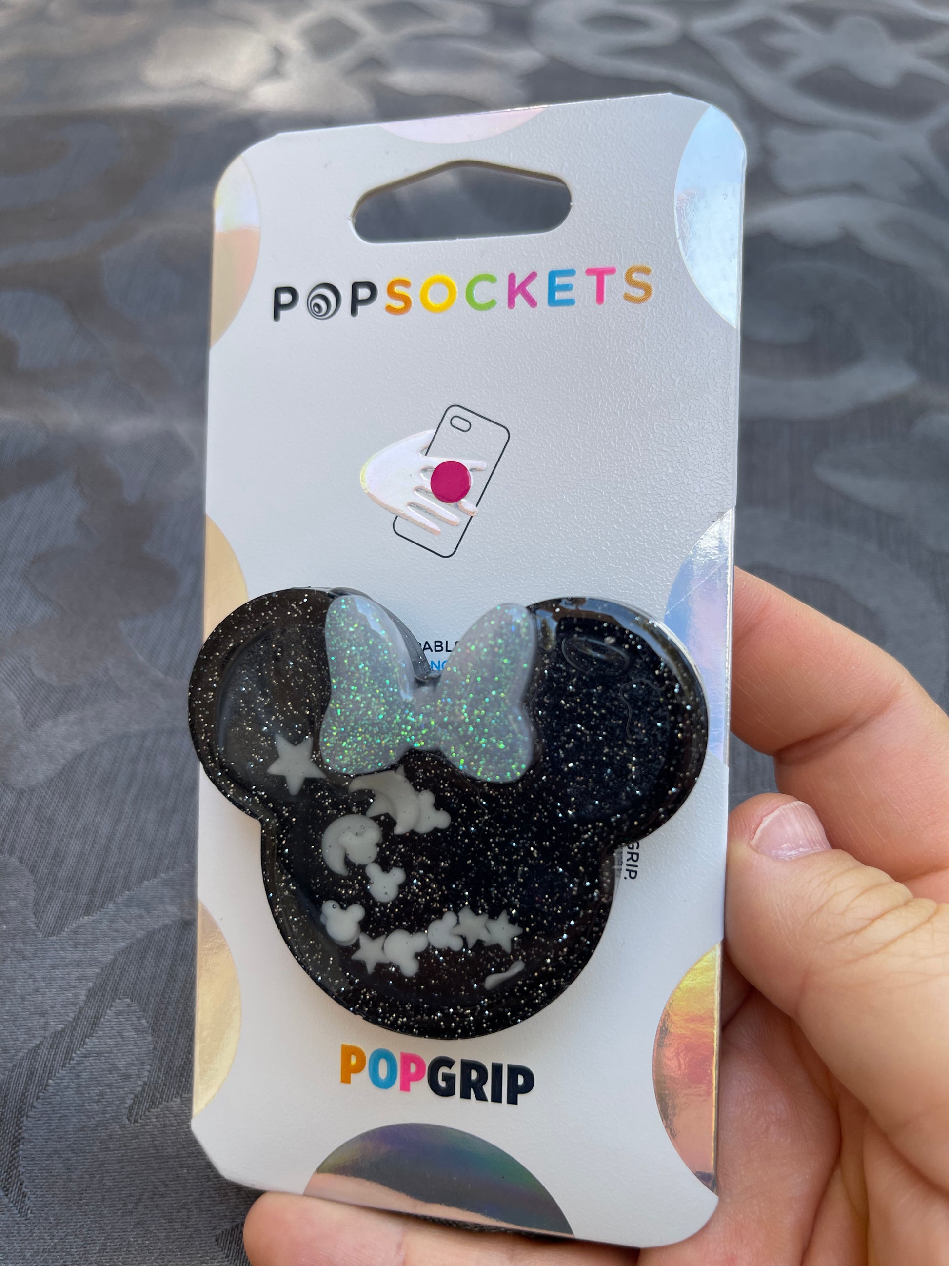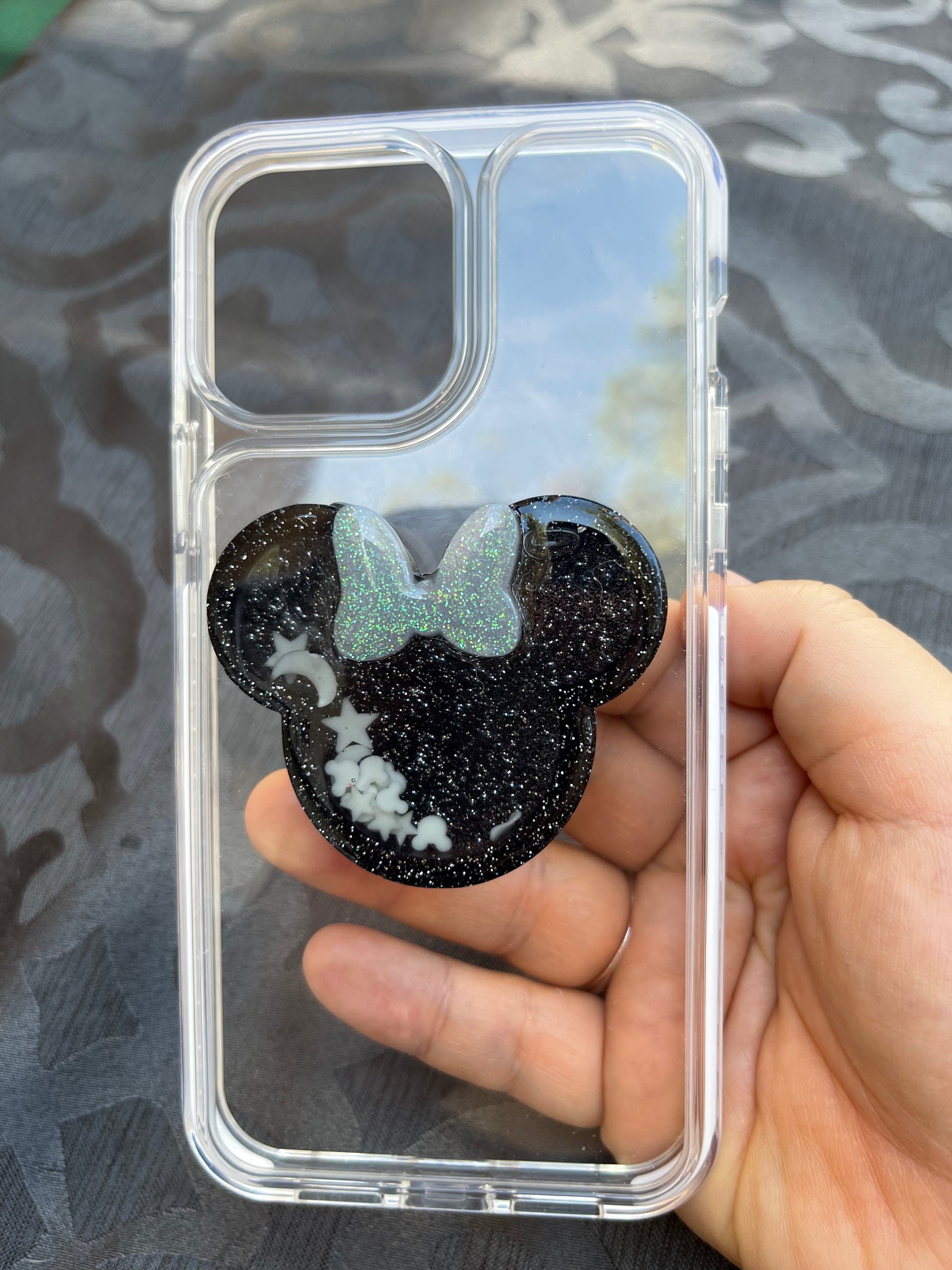 Glow Mouse w/bow shaker phone grip in Black with a White bow filled with glow in the dark stars and moons!
