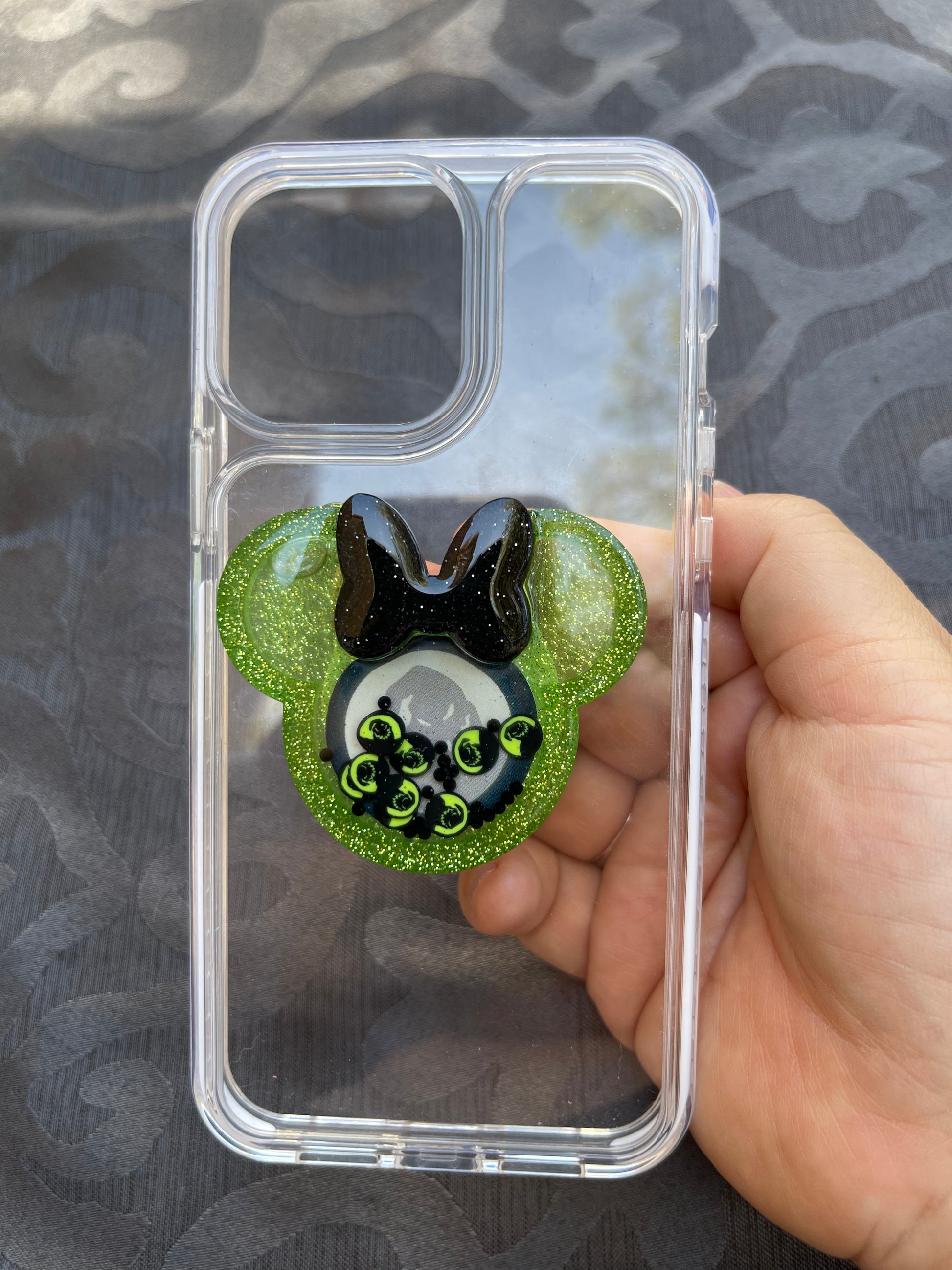 Oogie Boogie Mouse w/bow shaker phone grip in Neon Green with a Black bow filled with oogie boogie beads and glitter