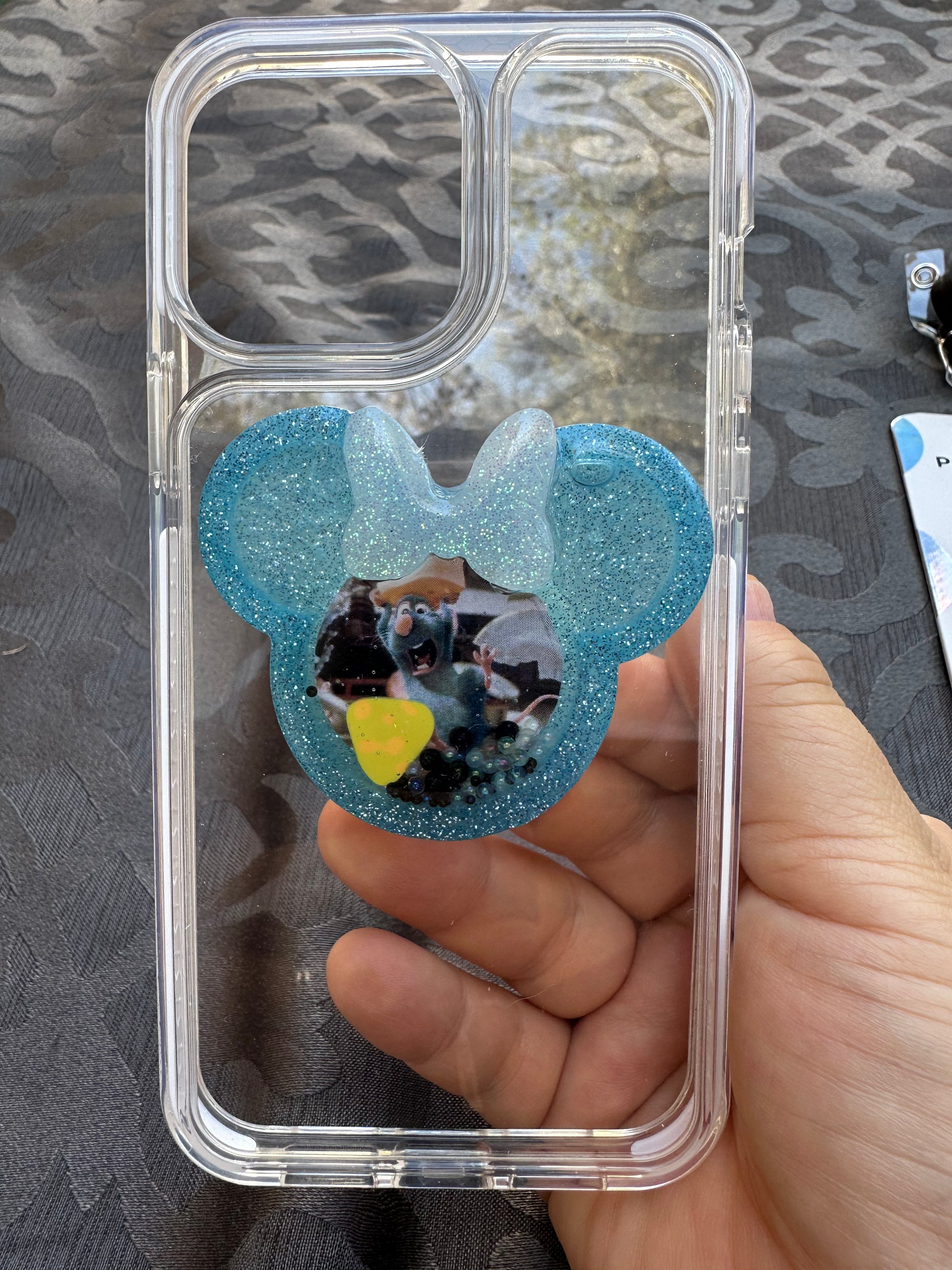 Ratatouille Mouse w/bow shaker phone grip in Blue with a White bow filled with pearls